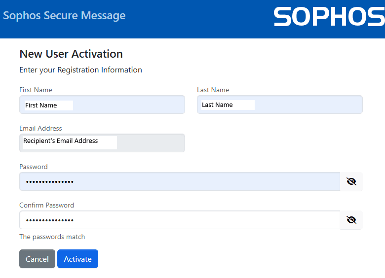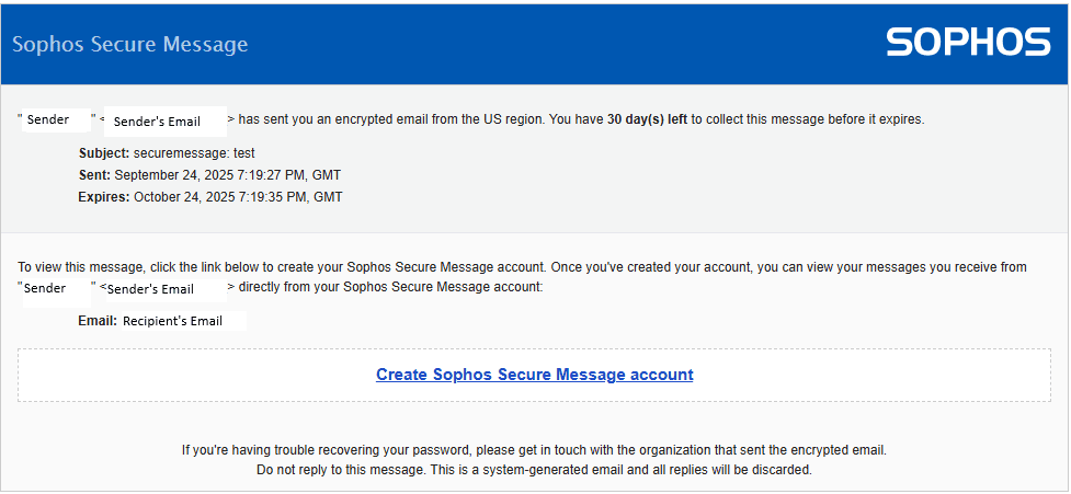 Clicking on Create Sophos Secure Message account will take them to a webpage for account setup.